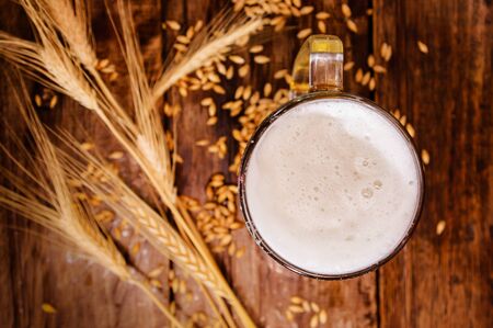 Above view of glass of light beer with foam, with a wheat branch and wheat on a wooden table background
