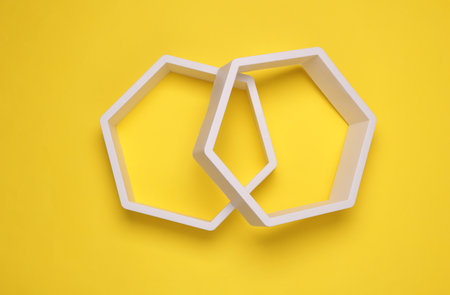 Blue hexagons form a beehive on a yellow background. One hexagon is separated from the figure. The concept of suspension. Copy space
