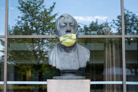 Lund, Sweden - July 9, 2020: Sculpture wearing a face mask during the coronavirus epidemic. Picture from Scania University Hospital area