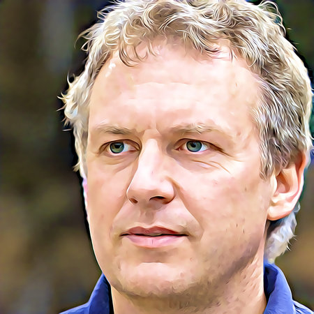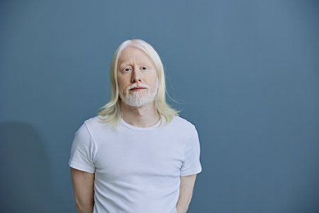portrait of a middle aged man with long blonde hair and a beard, dressed in a white t shirt, standing against a soft blue background that adds a serene feel to the image and highlights his features