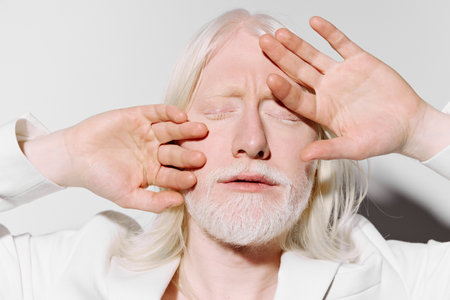 Portrait of a person with pale skin and white hair, eyes closed, hands placed on face, against a light background, conveying serenity and introspection in a minimalist setting