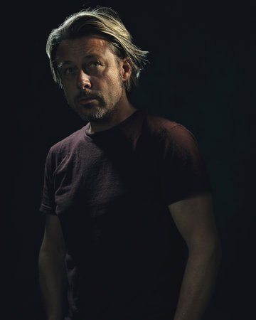 Dark portrait of a tough man with blond hair and a gray stubble in a dark brown t-shirt.