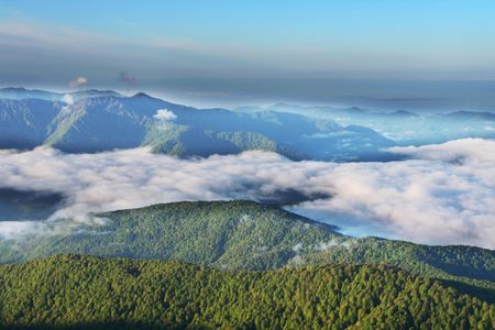 A beautiful shot of a forested mountain above the clouds under a blue sky