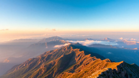 Serene Mountain Range with Mist and Dramatic Light Casting Shadows at Sunrise