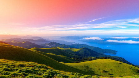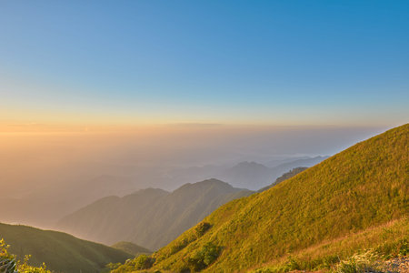 Morning landscape, a photo image of orange sky in the morning over a cloud layer and mountain with a fog cover on a basin in a valley, abstract background landscape background, tranquil background