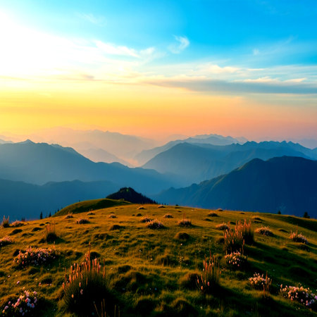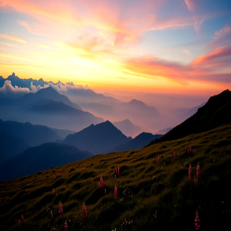 Sunset in the mountains with flowers in the foreground.