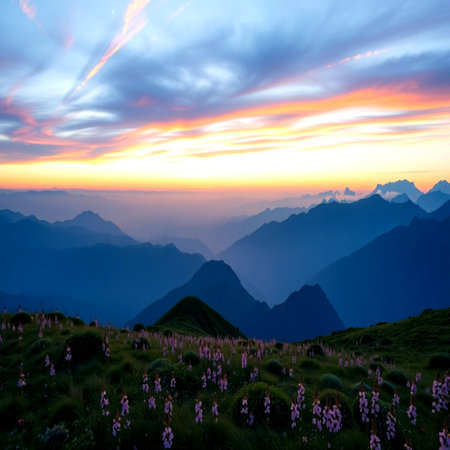 Mountain landscape at sunset with clouds and flowers in the foreground.