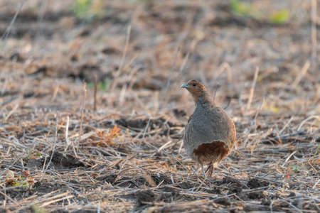 Gray partridge on a nesting place in a wasteland on the outskirts of a large city