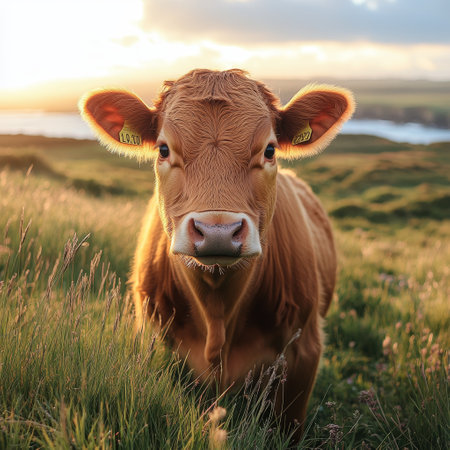 Calf gazing, sunset pasture, coastal Ireland, agriculture