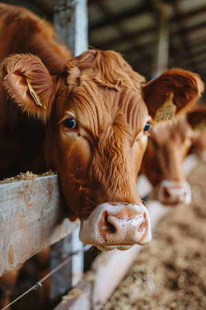 A cow with ear tags is looking directly into the camera. An ideal atmospheric scene with rustic comfort and a sweet mood