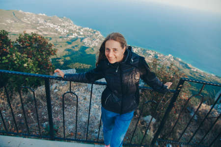 Fashion young girl with backpack in casual clothes glasses enjoying a view from the mountain to the sea.