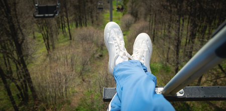 Feet Hanging in the Air First Person View. Above the City Park. Two People Riding a Ferris Wheel Top View