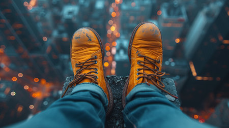 A thrilling perspective of feet in brown shoes dangling over a busy city street illuminated by nighttime lights.