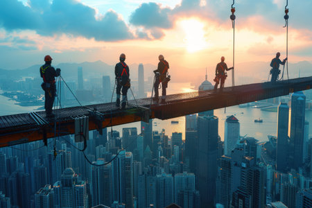 Bright morning light illuminates construction workers high above city.