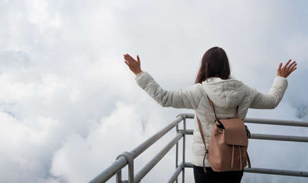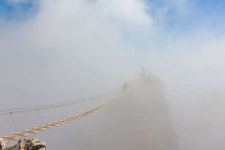 Betong, Thailand-April 5, 2023. Beautiful top view of sea of fog at Ai Yerweng Skywalk in Yala province, the longest skywalk in Asia. Tourists visit the landmark above forest during sunrise.