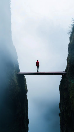Person stands on a wooden bridge overlooking a misty canyon at dawn