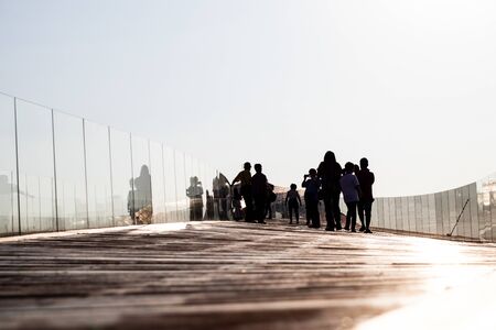 Sanya City, China-April 1, 2019: tourists play on the sea view glass trestle, Sanya City, Hainan Province, China