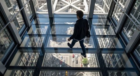 Elevated ambitions at sunset concept. A businessman stands on a high glass balcony overlooking a sprawling city at sunset. Ambition, vision, and the pursuit of success in the corporate world