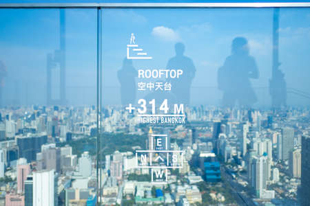 Young man sits on a glass floor on the roof of a King Power Mahanakhon building