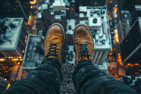 foot standing on the edge of a skyscraper roof, risk concept