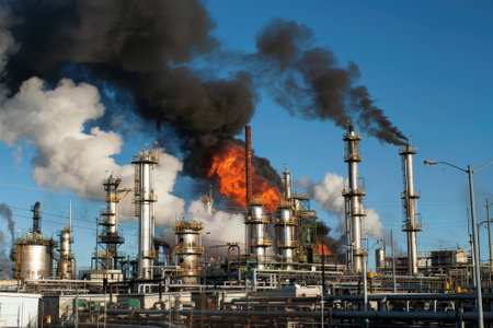A stunning industrial scene capturing the dramatic interplay of flames and smoke at an oil refinery. The dark stormy sky enhances the intense atmosphere, illuminating the structures with a captivating glow.