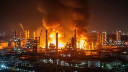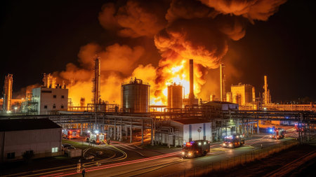 A captivating nighttime scene showcasing a massive industrial fire at an oil refinery. Flames and smoke create a dramatic atmosphere as bright lights reflect on the water.