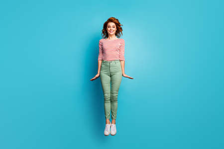 Full length photo of beautiful lady jumping high up rejoicing weekend nice weather sunny day wear casual red white shirt green pants footwear isolated blue color background