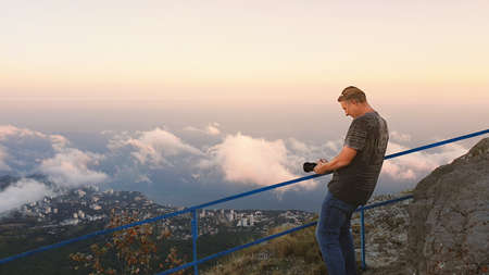 A young man enthusiastically photographs the clouds at his feet. A man stands high in the mountains above the clouds and takes pictures of a beautiful landscape.