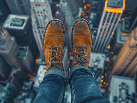Top view of worn leather boots and denim jeans, suspended high above a bustling urban landscape with glowing windows.