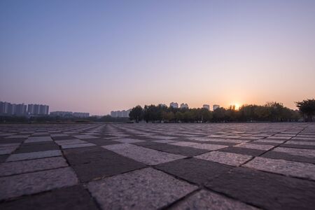 Empty city square marble pavement and beautiful blue sky in the background at sunrise