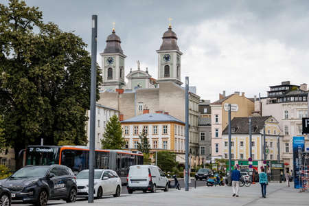 Linz, Austria, 29 August 2021: Baroque Old Cathedral with two towers, Narrow picturesque street with colorful renaissance buildings in historic center in medieval city at sunny summer day
