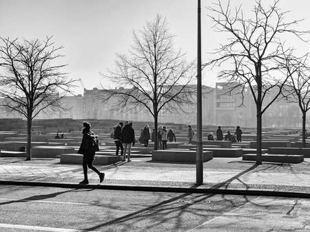 BERLIN, GERMANY - FEBRUARY 14, 2017: Tourists At The Memorial to the Murdered Jews of Europe, Berlin, black and white