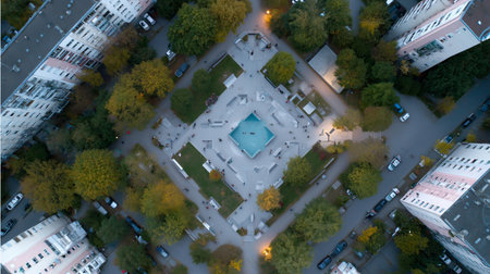 This stunning aerial view captures a roundabout embraced by vibrant autumn foliage, creating an engaging contrast with urban structures. The scene combines nature and city life seamlessly.