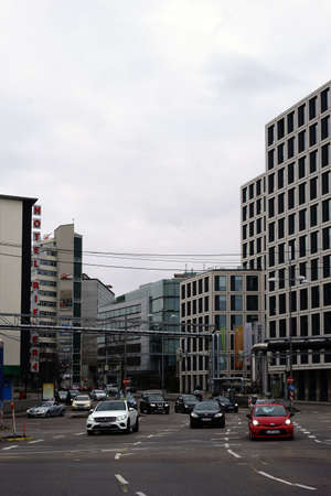 Stuttgart, Germany - February 03, 2018: Business buildings, hotels and traffic along the Theodor-Heuss-Street at the main station on February 03, 2018 in Stuttgart.