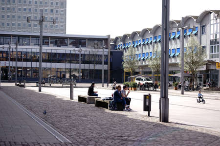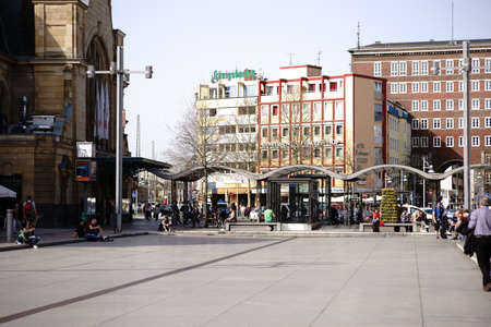 Koblenz, Germany - April 08, 2018: Travelers and people passing by at the station forecourt in front of the central station at good weather on April 08, 2018 in Koblenz.