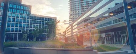 evening view of modern part of Slovakia capital city Bratislava, business district during summer sunset golden hour