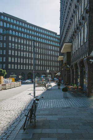 HAMBURG, GERMANY - 28 JUNE 2018: bicycles on street, people sitting in cafes