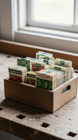 An intimate, top-to-bottom vertical shot capturing a beautifully organized hobbyist's seed collectio
