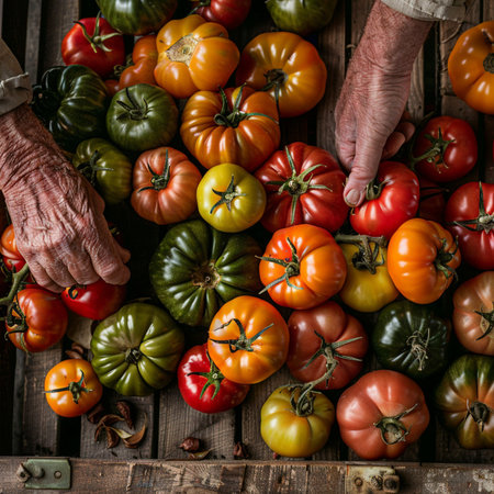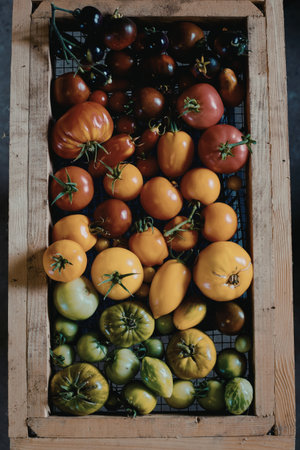 A collection of colorful heirloom tomatoes in various shades of red, orange, yellow, and green, displayed in a rustic wooden crate. The tomatoes are fresh and arranged in a visually appealing manner, showcasing their natural beauty and diversity.