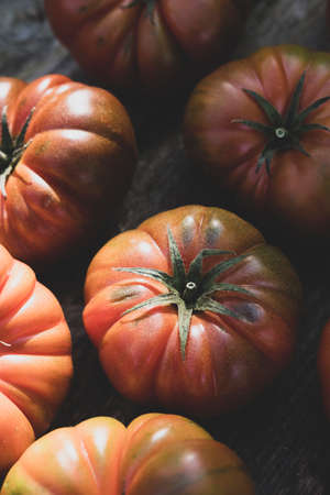 Top front view of a group of red tomatoes produced in an organic urban garden in a rural home field for own consumption