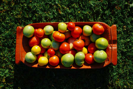 Top view of green and red tomatoes in wooden trough on freshly cut grass.