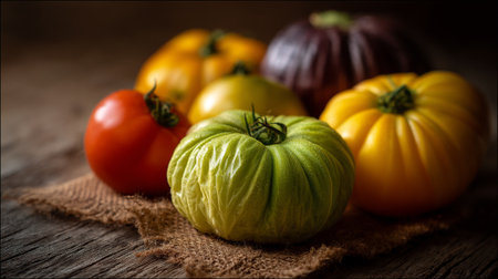 Heirloom tomatoes display their vibrant colors on a rustic wooden surface.