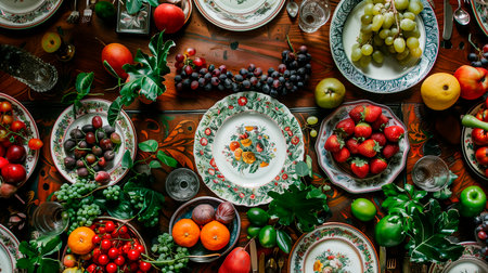 flat lay image of table with plates vases of ripe fruits on table, antique rome style feast, AI generated image
