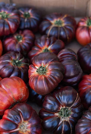 Heirloom tomatoes collection on black wooden background. Colorful tomatoes vatieties.