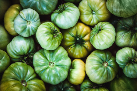 Green tomatoes harvested at organic homestead garden, homegrown veggies food background