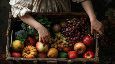 Organic vegetables on wood. Farmer holding harvested vegetables. Rustic setting