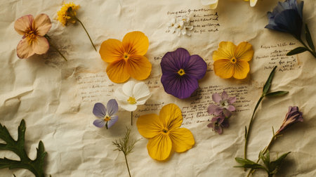 beautifully arranged collection of pressed yellow, purple, and white flowers and green leaves is displayed on a textured, aged paper background in Italy. High quality photo