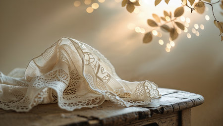 Delicate lace draped elegantly on a rustic wooden table with soft background lighting