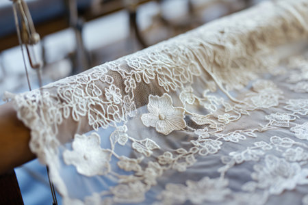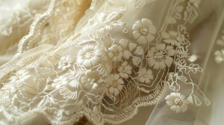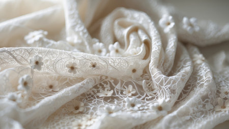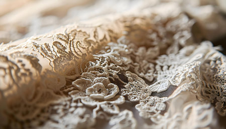A beautiful close-up of delicate lace fabric in soft light, showcasing intricate patterns and a creamy texture. Ideal for fashion or wedding themes.