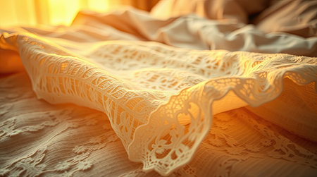 This image features a close-up view of delicate lace fabric showcasing intricate patterns and textures. The soft, warm light enhances its romantic and vintage appeal.